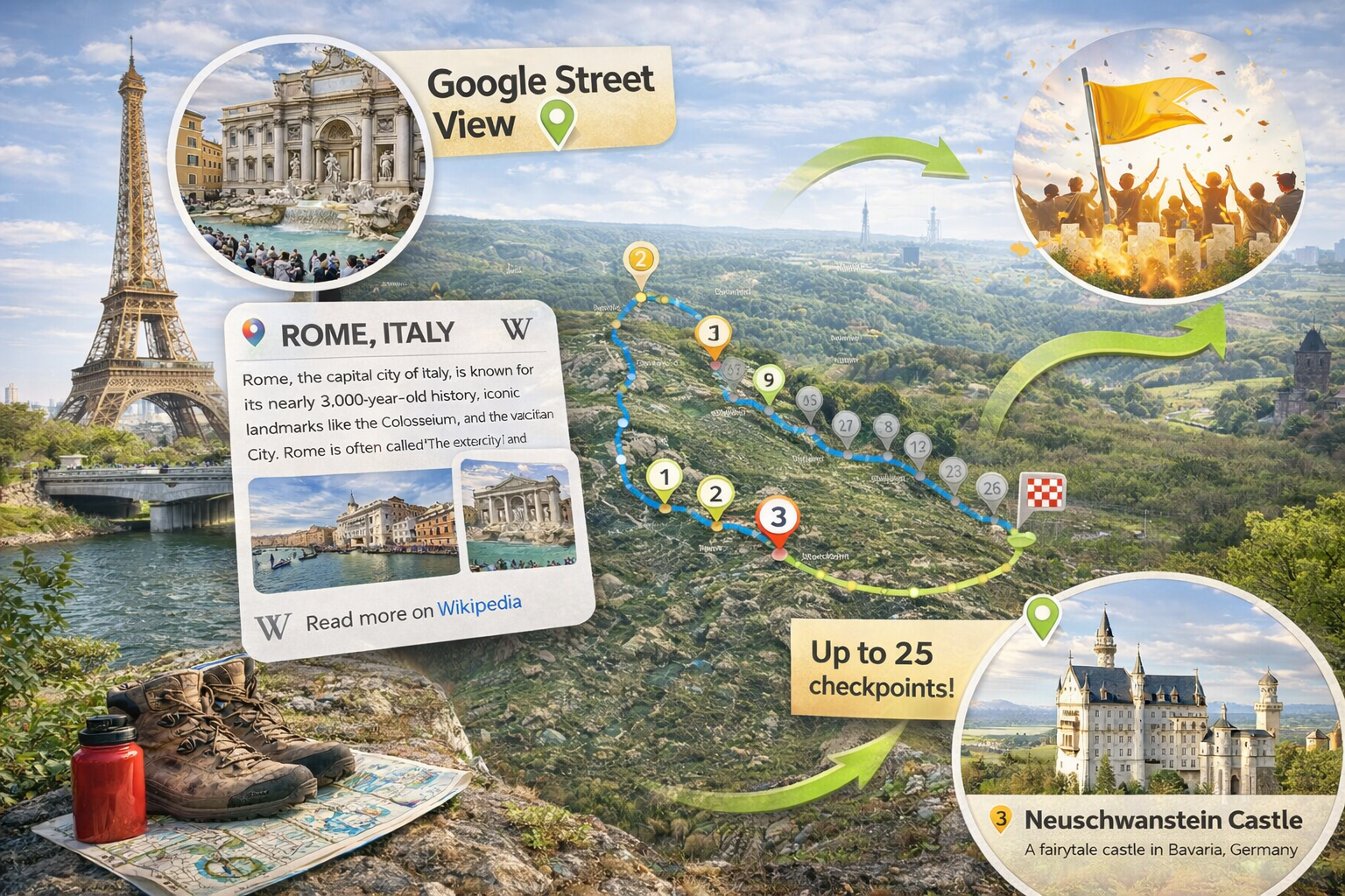 Utöver delmålen kan ni även använda Google Street View längs hela resan. Det innebär att deltagarna kan följa färden steg för steg och till exempel upptäcka platser de känner igen – allt från att passera sin födelseort till att känna igen gator, torg och miljöer som väcker minnen och igenkänning.